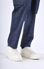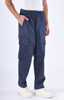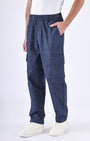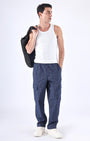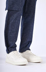 Relaxed fit striped pants in a comfortable stretch fabric with an elasticated waistband with concealed drawstrings featuring front pockets, rear patch pockets, button fasten cinches at the leg opening to taper to the leg and a straight leg cut and zip fly.