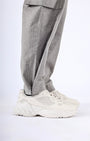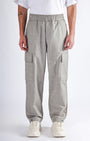 Relaxed fit striped pants in a comfortable stretch fabric with an elasticated waistband with concealed drawstrings featuring front pockets, rear patch pockets, button fasten cinches at the leg opening to taper to the leg and a straight leg cut and zip fly.