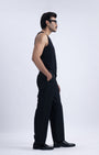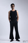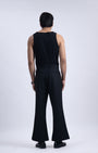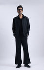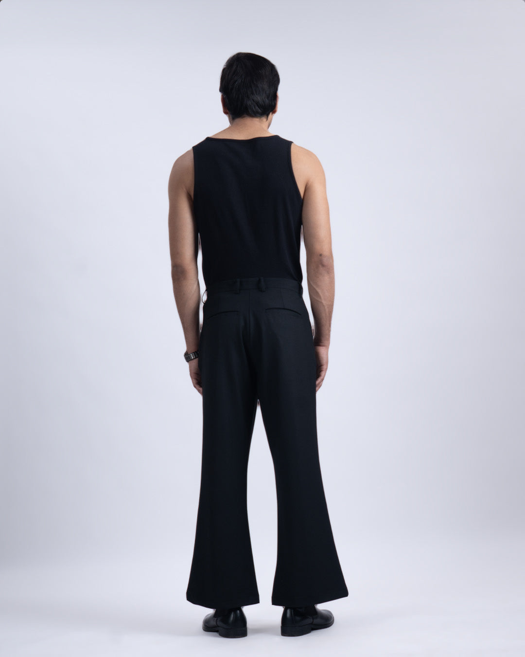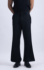 Relaxed fit bell bottom trousers in a comfortable high stretch and ligt medium weight polyester viscose blend wrinkle resistant fabric with a classic waistband featuring front pockets, jetted back pockets and zip fly.
