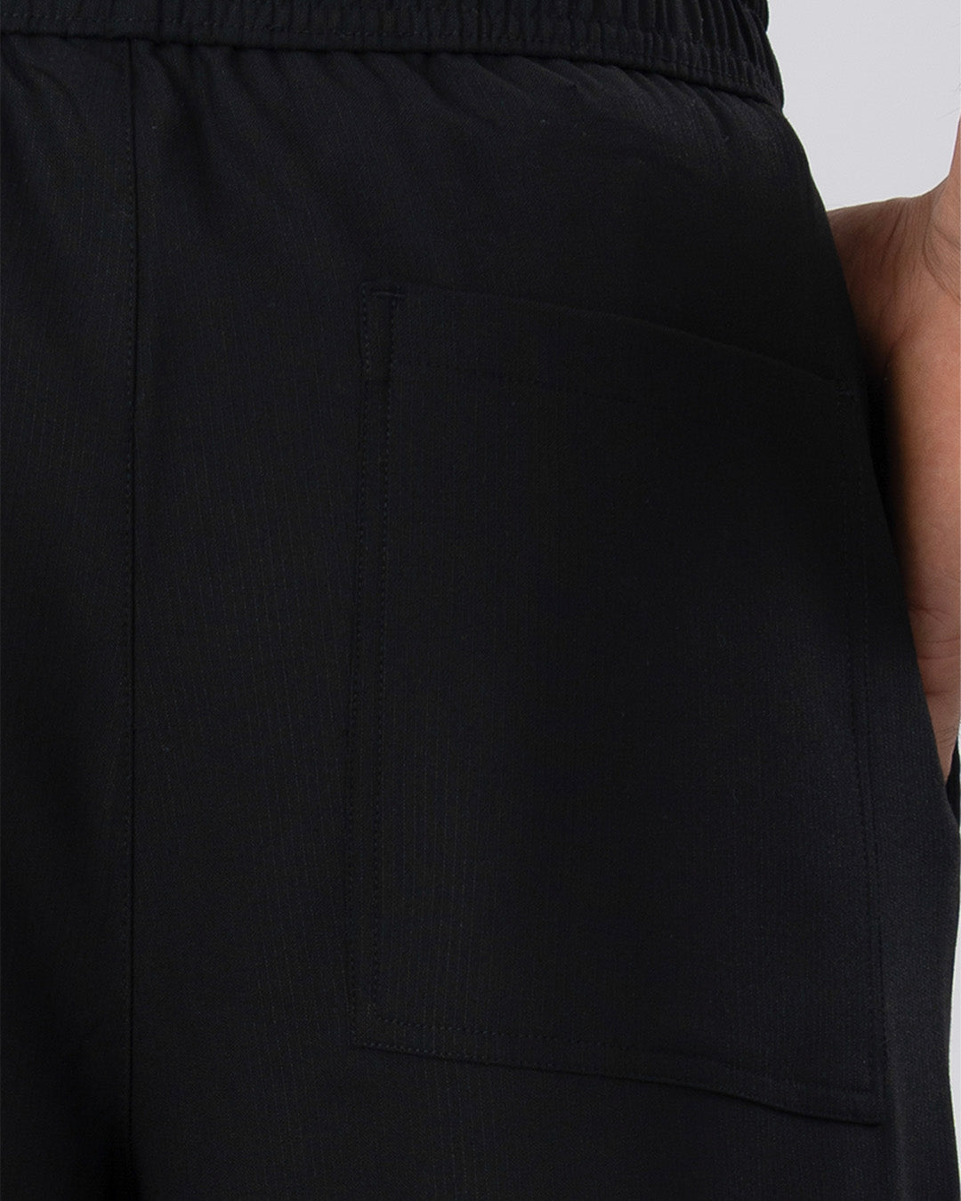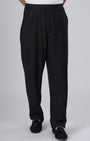 Relaxed fit trousers in a comfortable high stretch and light medium weight polyester-viscose blend wrinkle-resistant fabric with a classic elasticated waistband featuring front pockets, patched back pocket, and concealed drawstrings.