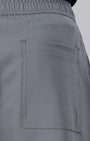 Relaxed fit trousers in a comfortable high stretch and light medium weight polyester-viscose blend wrinkle-resistant fabric with a classic elasticated waistband featuring front pockets, patched back pocket, and concealed drawstrings.