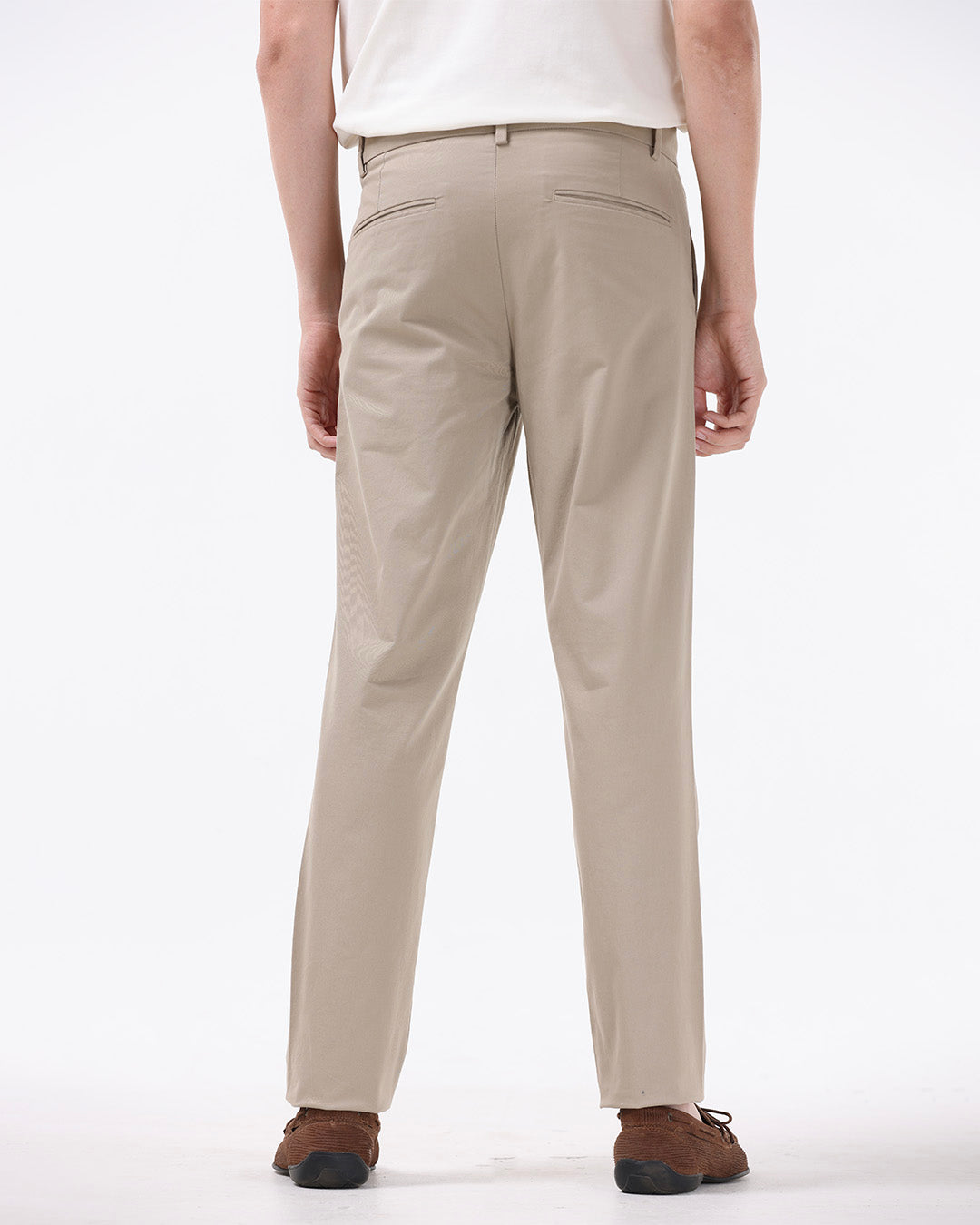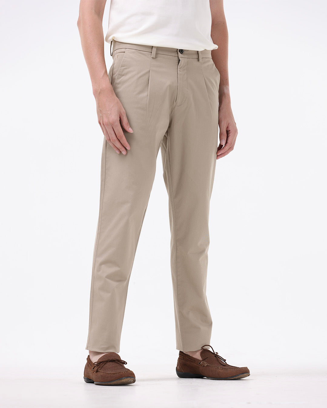 Tailored fit pleated pants in a comfortable cotton stretch fabric with a classic waistband featuring front pockets, rear welt pockets, and French zip fly for better comfort.