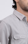 Tailored fit shirt in a comfortable high stretch polyester viscose fabric featuring long sleeves, buttoned cuffs, front flap pockets and spread collar.