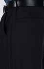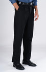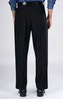 Relaxed fit trousers in a comfortable high stretch and light medium weight polyester-viscose blend wrinkle resistant fabric with a classic waistband featuring front pockets, jetted back pockets, zip fly and button closure.