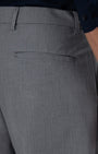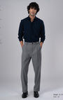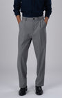 Relaxed fit trousers in a comfortable high stretch and light medium weight polyester-viscose blend wrinkle resistant fabric with a classic waistband featuring front pockets, jetted back pockets, zip fly and button closure.