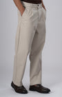Relaxed fit pleated trousers in a comfortable high stretch and light medium weight cotton fabric with a classic waistband featuring front pockets, jetted back pockets, zip fly and button closure.
