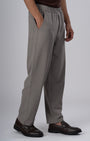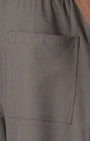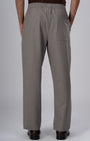 Relaxed fit trousers in a comfortable high stretch and light medium weight polyester-viscose blend wrinkle-resistant fabric with a classic elasticated waistband featuring front pockets, patched back pocket, and concealed drawstrings.