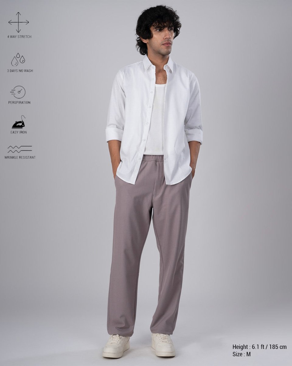 Relaxed fit trousers in a comfortable high stretch and light medium weight polyester-viscose blend wrinkle-resistant fabric with a classic elasticated waistband featuring front pockets, patched back pocket, and concealed drawstrings.