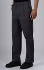 Relaxed fit pleated trousers in a comfortable high stretch and light medium weight cotton fabric with a classic waistband featuring front pockets, jetted back pockets, zip fly and button closure.