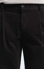 Relaxed fit pleated pants in a comfortable cotton corduroy fabric with a classic waistband featuring concealed drawstrings, front pockets, jetted back pockets, and zip fly.