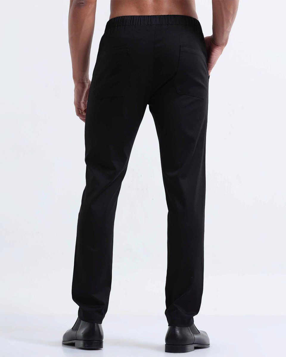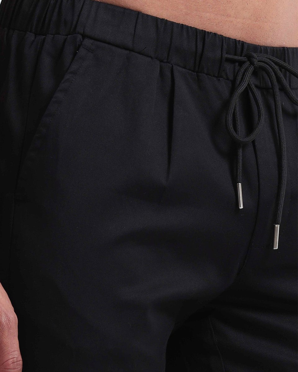 Tailored fit ankle pant in rich cotton stretch fabric with a flexi elasticated waistband featuring adjustable drawstrings, front pockets, a back pocket, and a zip fly.