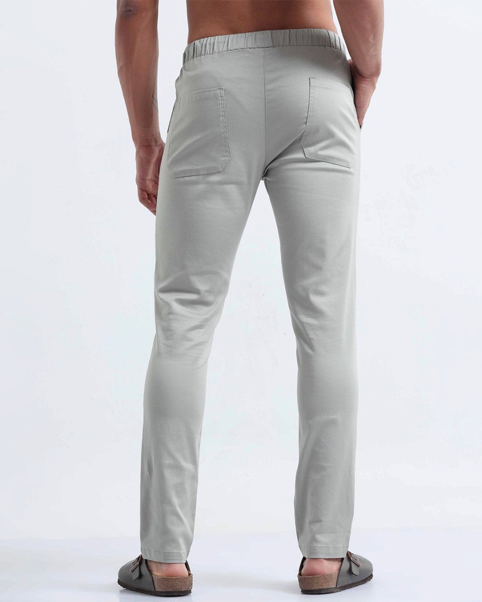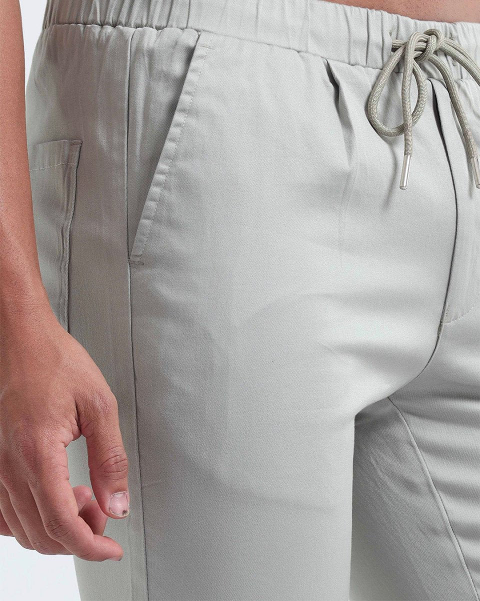 Tailored fit ankle pant in rich cotton stretch fabric with a flexi elasticated waistband featuring adjustable drawstrings, front pockets, a back pocket, and a zip fly.