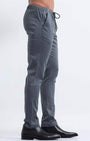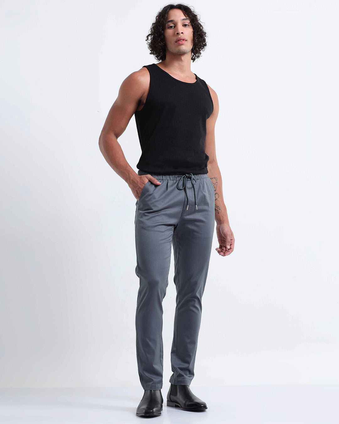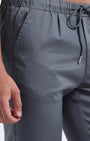Tailored fit ankle pant in rich cotton stretch fabric with a flexi elasticated waistband featuring adjustable drawstrings, front pockets, a back pocket, and a zip fly.