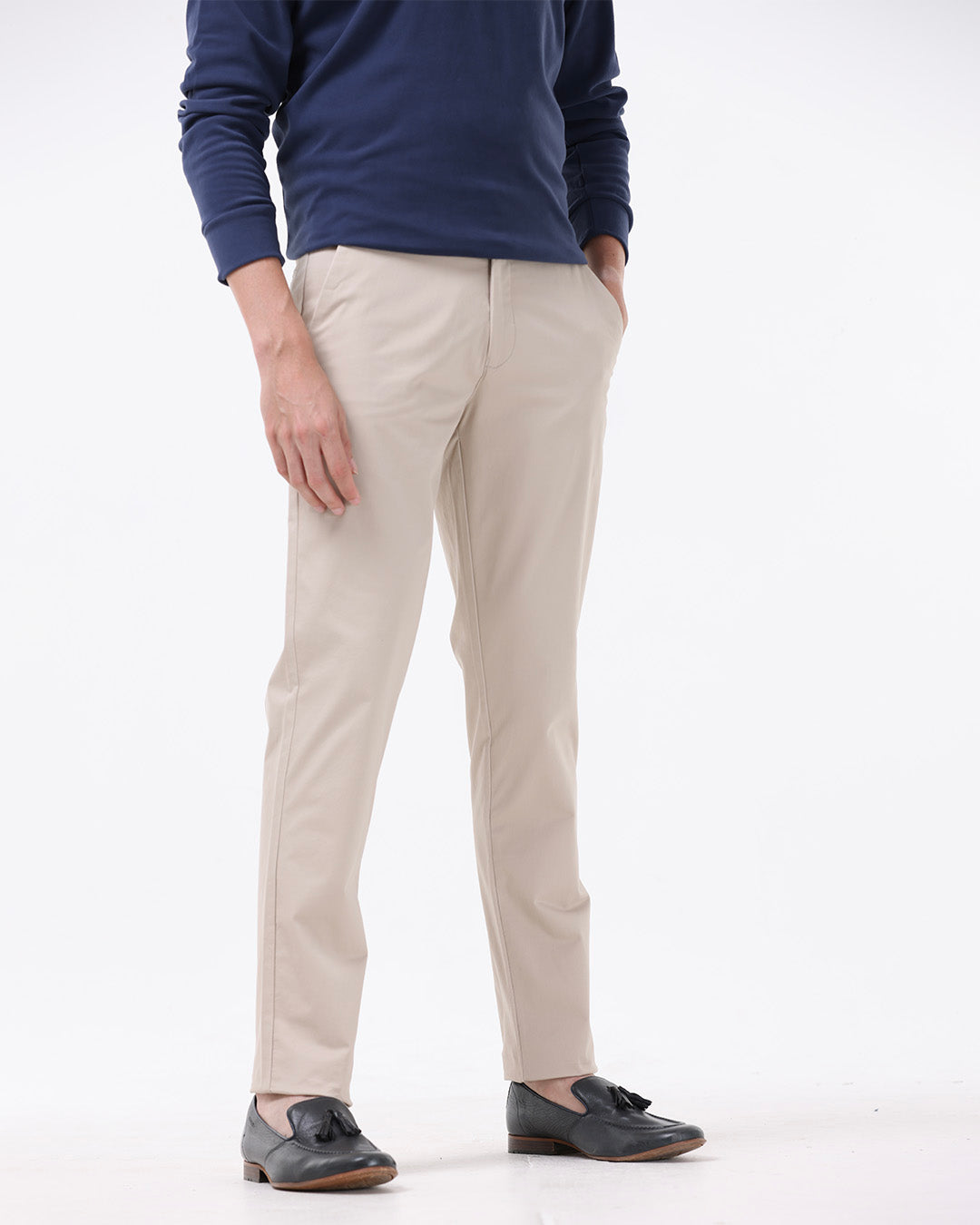 Tailored fit soft feel chinos in a comfortable cotton stretch fabric with a classic waistband featuring front pockets, rear welt pockets, and French zip fly for better comfort.