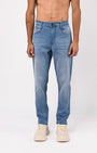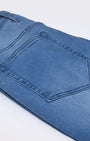 Tailored fit denim in a comfortable high stretch and light weight cotton fabric with a classic waistband featuring front pockets , patched back pockets, and zip fly.