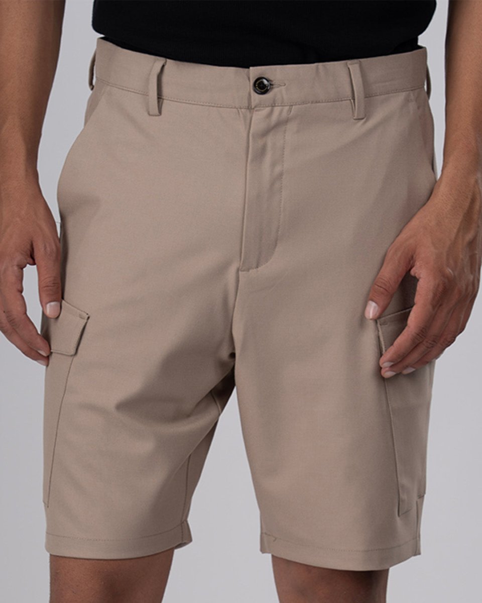 Tailored fit shorts in a comfortable high stretch and light medium weight polyester-viscose blend wrinkle resistant fabric with a classic waistband featuring front pockets, jetted back pockets, side cargo pockets, zip fly and button closure.