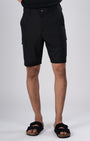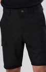 Tailored fit shorts in a comfortable high stretch and light medium weight polyester-viscose blend wrinkle resistant fabric with a classic waistband featuring front pockets, jetted back pockets, side cargo pockets, zip fly and button closure.