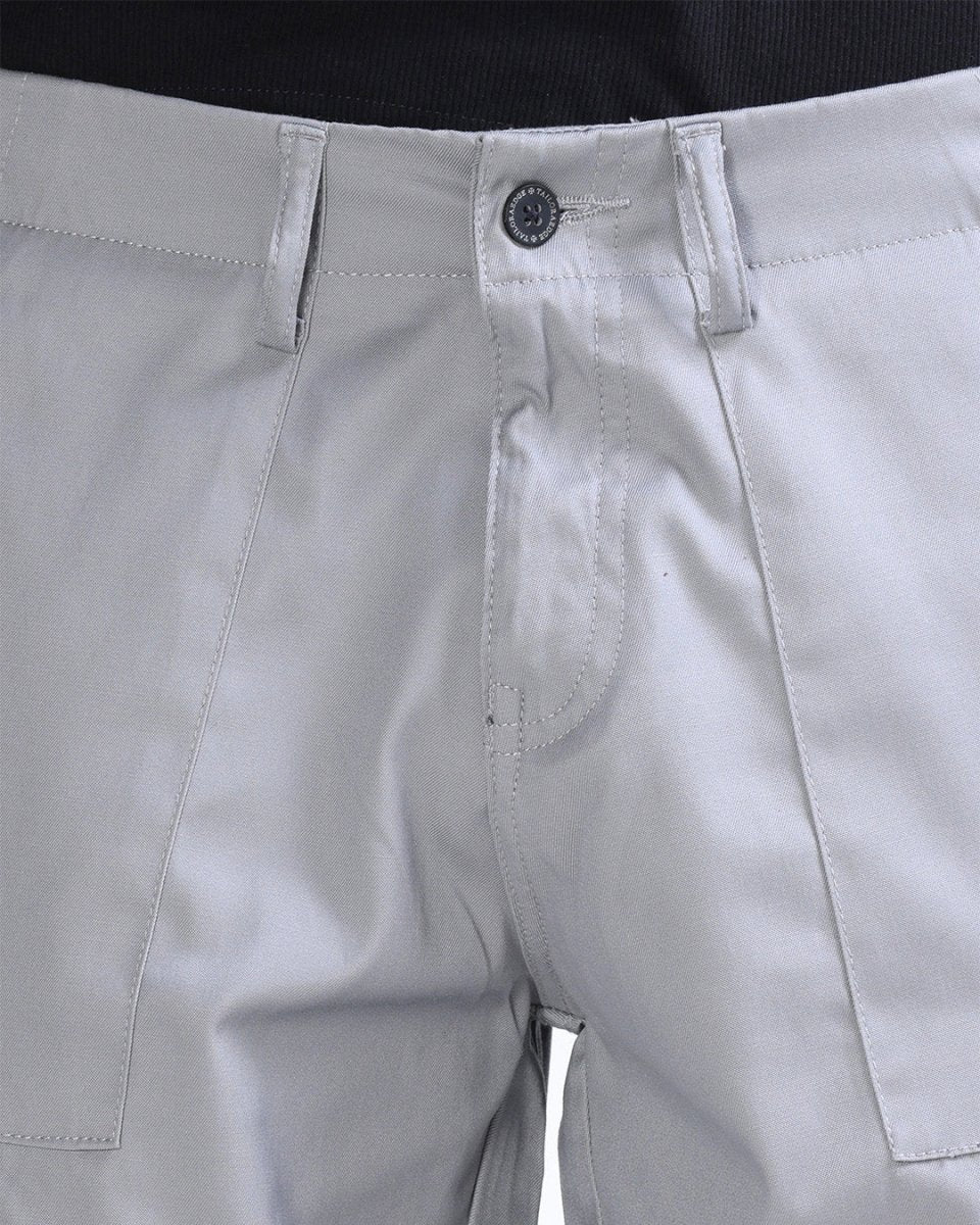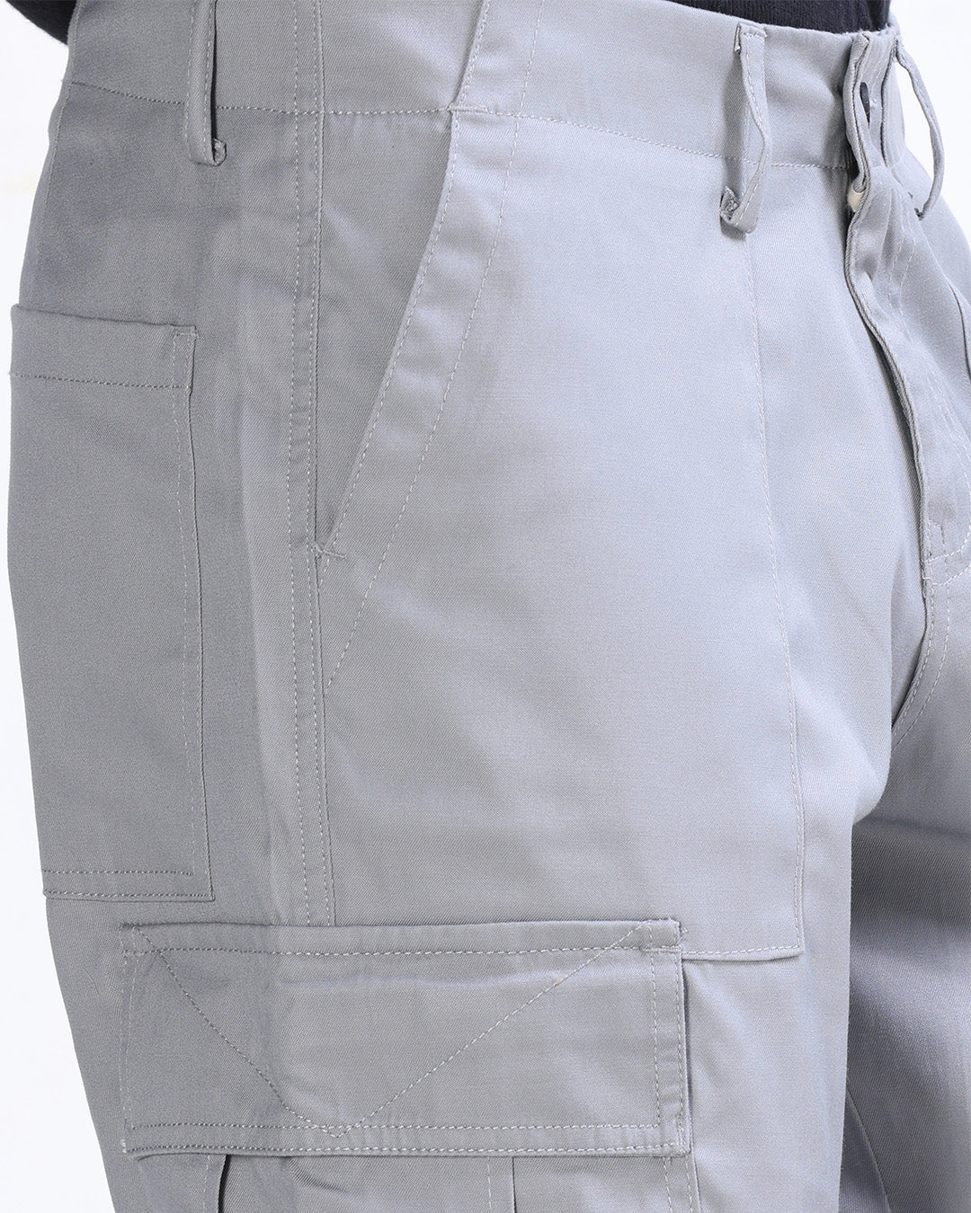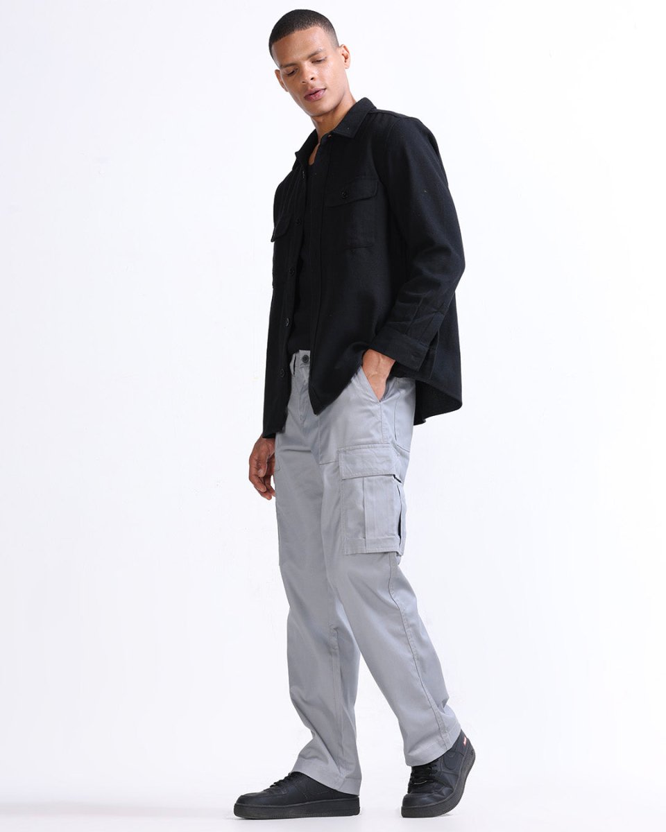 Relaxed fit cargo trousers in comfortable stretch fabric with locked side cargo pockets, front and rear patch pockets, and zip fly.