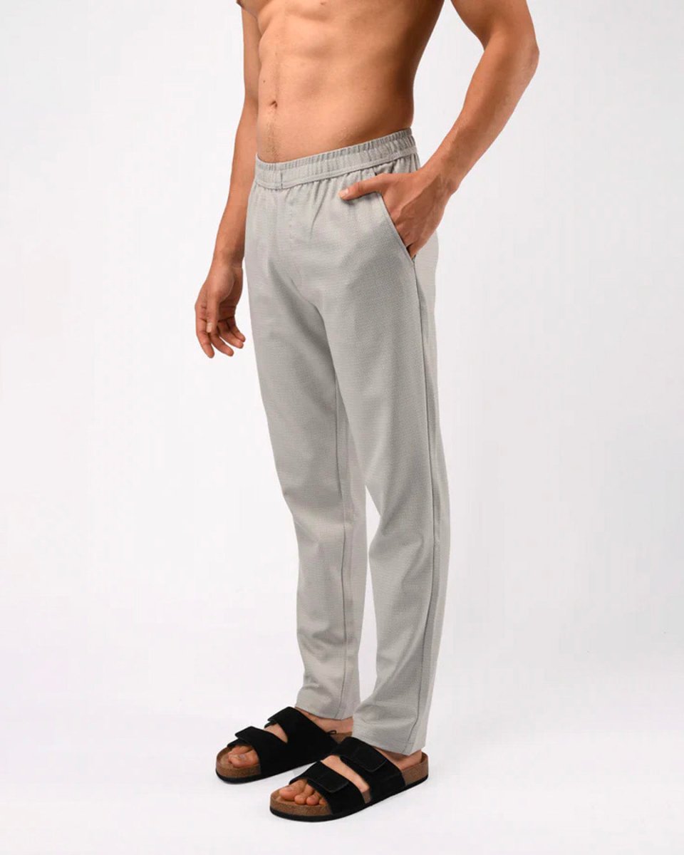 Tailored fit trousers in a comfortable high stretch and light medium weight polyester-viscose blend wrinkle-resistant fabric with a classic elasticated waistband featuring front pockets, patched back pockets and concealed drawstrings.