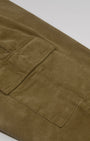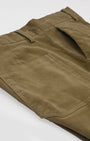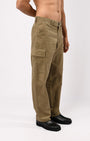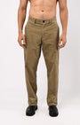 Relaxed fit cargo pants in a comfortable cotton corduroy fabric with a classic waistband featuring concealed drawstrings, front pockets, side cargo pockets, patched back pockets and zip fly.